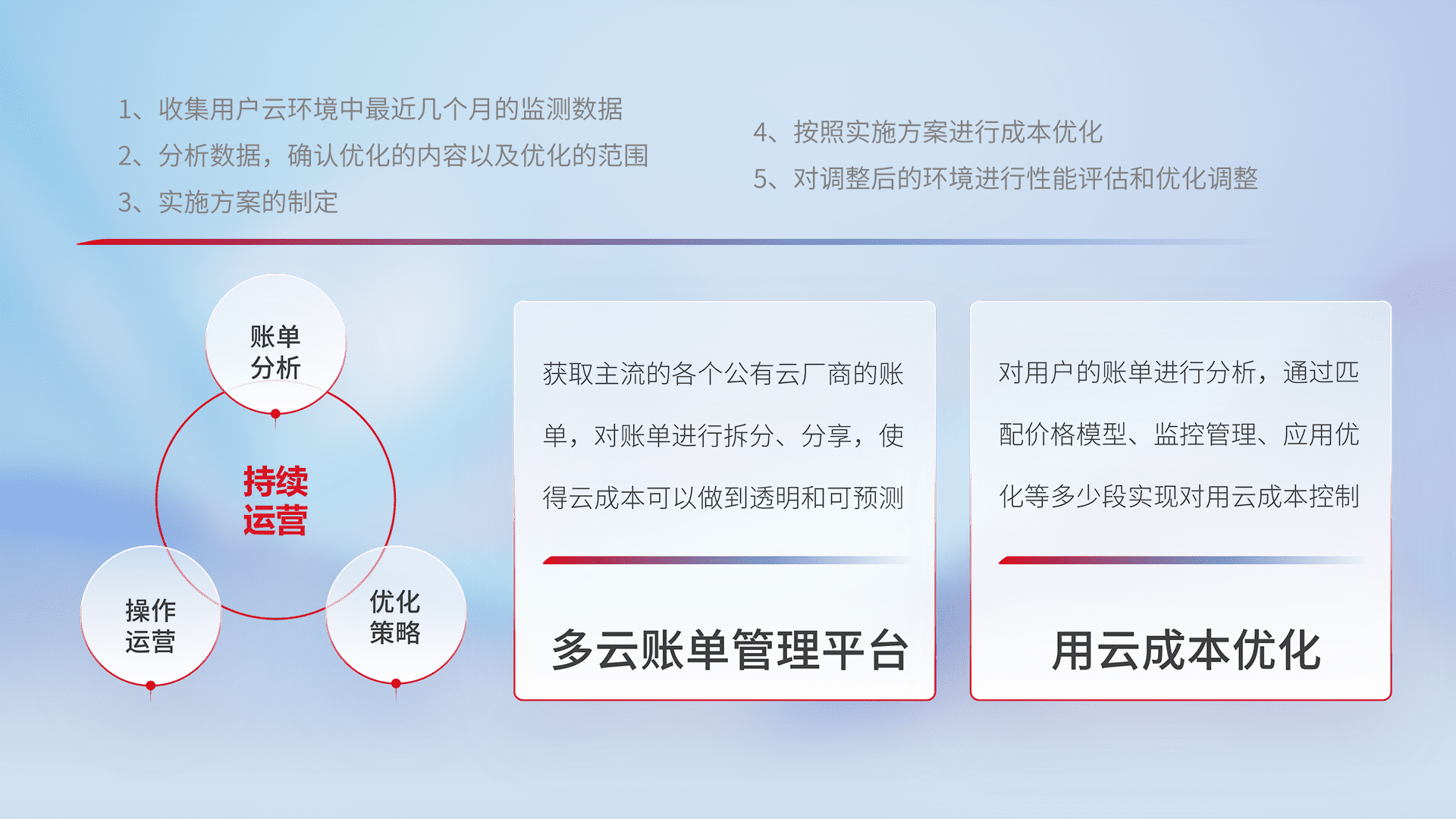 通过多云纳管,,,,以统一的资源数据模型把客户的云资源进行抽象和封装,,,,进而实现对多云资源的统一操作,,保障云资源管理的可靠性、、、稳定性与可用性。。。。量身定制化运维内容,,,配置、、开发运维、、、、补丁管理、、、备份、、监控、、、、认证和访问管理、、、审计和日常巡检等,,保障在用云过程中的可靠度,,,,稳定度以及高可用率。。